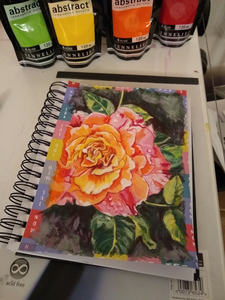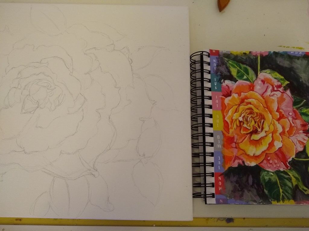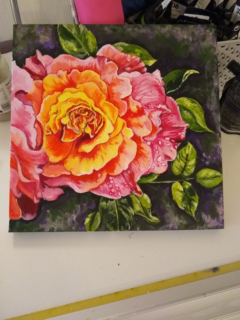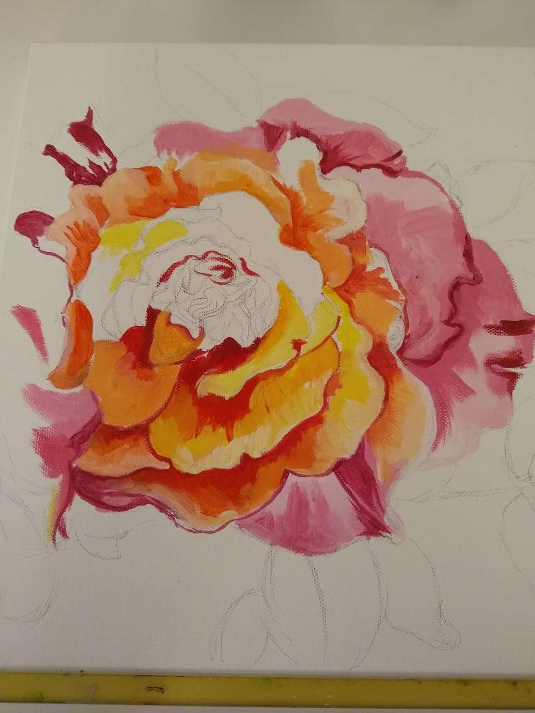 Recently I found this beautiful image of two roses and loved the colours! After experimenting in my sketchbook with some new acrylic paints purchased, I have drawn my image out on a 12″ x 12″ canvas. These above are the steps and progression of my painting. Working out the arrangement of the petals and different shades of yellows, oranges and pinks. I love the dark background as it makes the rose stand out. I have almost finished and currently working on the final details of the water droplets on the petals. Hope to post soon x